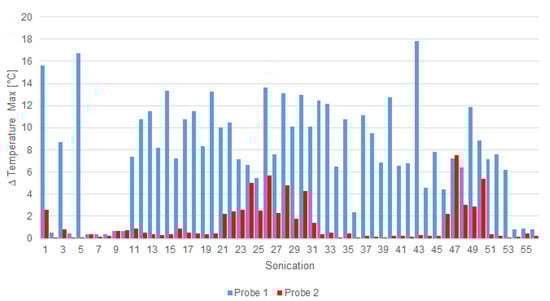 Maximum rise of temperature in each sonication for probe 1 (blue) and probe 2 (red).