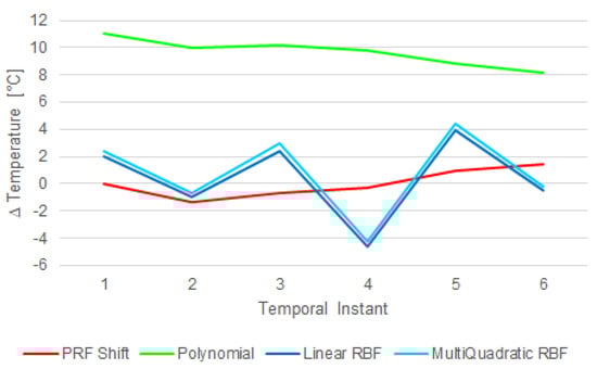 RBF and polynomial interpolations were applied on the data set; the former showed a “bump-like” tendency and the latter overestimated the temperature, because the analyzed area was characterized by a low signal intensity where the noise was a significant component (Figure 11).