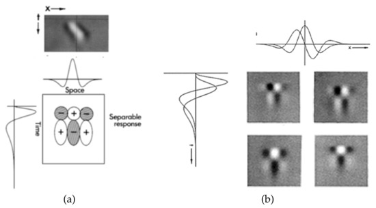 As proved by several neurological studies [31,32,33], the human visual system is sensitive to motion even in the preattentive phase. The response of neurons that are sensitive to motion can be modeled as the impulse response of separable spatio-temporal filters. The combination of the single responses of specific spatio-temporal filters allows a good approximation of neurons’ sensitivity to motion direction (left/right). The idea is represented in Figure 1. A separable spatio-temporal filter is defined as