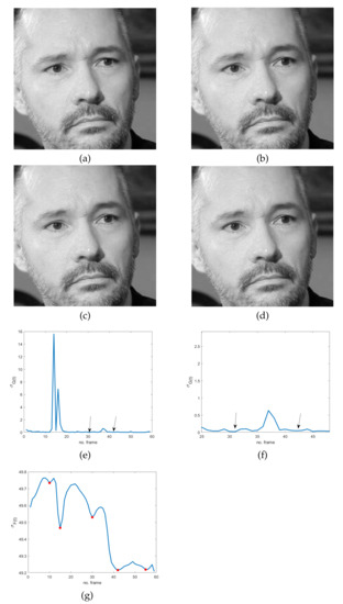 Four frames of the sequence cut 15.1 in the MEVIEW dataset [38]: (a) frozen frame before a microexpression (ME) ( surprise); (b) ME onset; (c) ME apex; (d) frozen frame after ME; (e) temporal global energy measured as the standard deviation of the spatio-temporal filtered sequence using the filter in Equation (1)—the arrows indicate frozen frames; (f) standard deviation restricted to the group of frames containing the ME; (g) standard deviation of the spatio-temporal filtered sequence using the filter in Equation (2) restricted to the group of frames containing a ME—markers correspond to local minima.