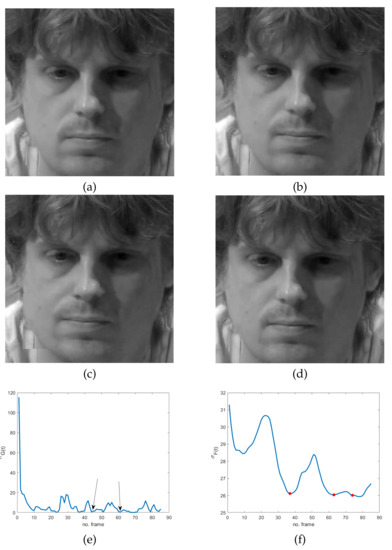 The use of frozen frames implies that a global absence of motion in the temporal sequence does involve the whole facial region; it means that we expect a minimum/zero in the energy of the response of the high-pass filter. Unfortunately, even though the latter is sensitive to very subtle and fast movements, it also has the same drawbacks of pixel-based motion estimators—i.e., artifacts are more visible than motion. As a result, the response of the spatio-temporal filter LH can be quite noisy, making ME detection troublesome and somewhat ambiguous. Specifically, local temporal minima can provide false alarms in the analyzed cases, as is evident in Figure 2e, Figure 3e and Figure 4e: several points, other than the ones corresponding to ME frozen frames in the energy signal, are close to zero. The energy signal is computed as the standard deviation of the spatio-temporal filtered video sequence using a filter as the one defined in Equation (1).