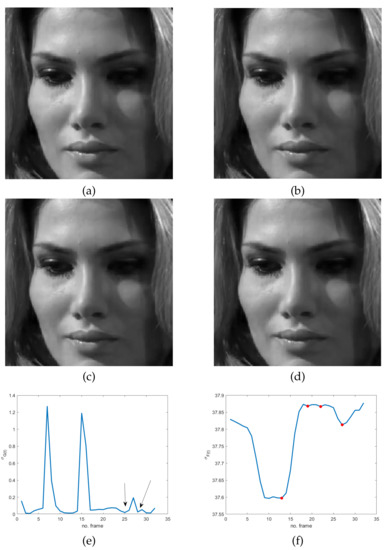 Four frames of the sequence cut 14.3 from the MEVIEW dataset [38]: (a) frozen frame before ME (happy); (b) ME onset; (c) ME apex; (d) frozen frame after ME; (e) temporal global energy measured as the standard deviation of the spatio-temporal filtered sequence using the filter in Equation (1)—the arrows indicate frozen frames; (f) standard deviation of the spatio-temporal filtered sequence using the filter in Equation (2) restricted to the group of frames containing the ME—markers correspond to local minima.