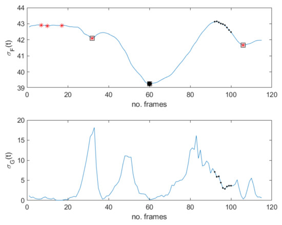 the spatial standard deviation of any function depending on both space and time (t) variables, where is the corresponding mean value, while is the dimension of the spatial domain. The next proposition proves that the minima of the standard deviation of F are strictly correlated to frozen frames, i.e., those characterized by lack of motion.