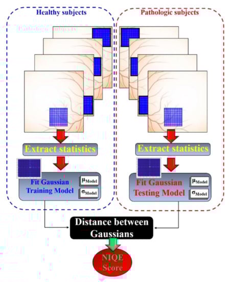 Natural Image Quality Evaluator (NIQE) computes blind image quality assessment comparing the restored image to a predefined feature model [] in order to evaluate the restoration in every iteration, allowing establishing a stopping criterion of the deconvolution when the maximum NIQE score is reached. In this work, we have developed our own trained NIQE model by extracting information from a reference image dataset. This process starts by partitioning every image of the dataset selected as a reference in small blocks that can allow significant spatial segmentation. In our case, blocks of 40 × 40 pixels of a total image size of 400 × 400 pixels were selected for extracting the covariance, mean luminance, and image sharpness properties. These parameters provide the reference of the model, where the outputs of the fitting are the multivariate mean and standard deviation of the Gaussian. The model stores the statistical outputs of those blocks that are used as a reference. Once the trained NIQE model is performed, the same statistical feature extraction is applied to the testing images from the dataset to create the testing Gaussian model. Finally, the NIQE score is calculated by computing the distance between trained (reference) and testing Gaussians as schematized in Figure 2. In this work, we have used the image dataset described in Section 2.1. This dataset is composed of three groups of subjects: healthy, glaucoma, and diabetic retinopathy patients. Focusing on the goal of restoring IS in retinal images, in this work, we have established the healthy group as a reference due to the absence of straylight sources that originated by ocular pathologies. In this sense, as referenced in the Introduction, the pathological groups (glaucoma and retinopathy) are susceptible of high generation VG effects due to pathological IS sources, which were then set as testing images.