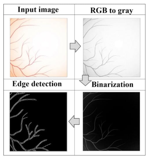 Retinal image segmentation was carried out using a classical image processing procedure summarized in Figure 3. The RGB input image is converted to a gray scale and binarized, once the intensity image is created. The “Canny” filter [] was applied using the same thresholding sensitivity for egde detection.