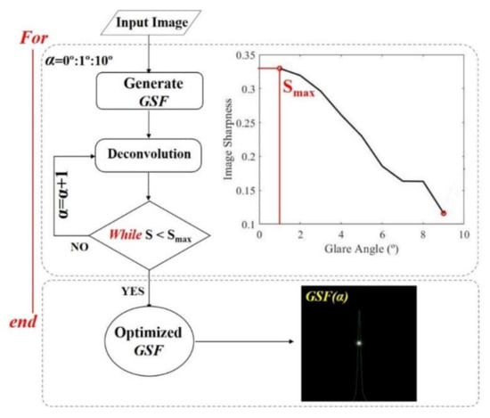 The program reads the grayscale image and generates an initial GSF for a null glare angle (α), performs a non-iterative deconvolution operation, and then calculates the sharpness (S) of the restored image. The process keeps working by increasing α in steps of 1° in each iteration of the deconvolution until the maximum S is found by employing the Hill-Climbing searching concept []. This point generates the optimal GSF as a function of the α value at the stopping process, as shown in Figure 4. The optimal GSF is given when the iteration as a function of the α range is stopped at the maximum found S value.