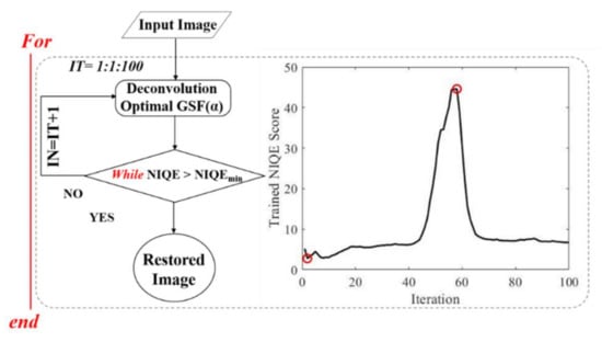 Once the optimized GSF is computed in Step #1, the algorithm keeps running Step #2 by comparing the NIQE image quality metric with the trained model (detailed in Section 2.4) as a function of the iteration number (IT). Once the maximum NIQE score is found, the iteration stops and the program generates the final restored image. The optimal IT corresponds to the maximum found NIQE score that established the optimized stopping criterion at which the final deconvolution can be performed as a function of two optimal parameters: glare angle of the GSF and iteration number of the deconvolution, as shown in Figure 5. The algorithm was written and compiled in MATLAB 2019b (The Mathworks Inc., Natick, MA, USA).