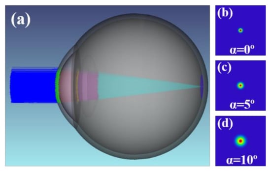 Optical human eye models are usually employed to evaluate the performance and design of intraocular lenses [], soft contact lenses, or to explore ocular aberrations []. Our group recently reported a scattering eye model to quantify IS by direct optical methods []. In this work, we modified this model (details on the straylight eye model can be found elsewhere []) to incorporate cataracts as straylight source, given the impact of cataracts grade on retinal fundus imaging. Figure 6 shows a shaded representation of the IS model (Figure 6a) incorporating a ray-tracing of a collimated gaussian beam focused on the retina of an emmetropic eye. The straylight model was applied to the entire anterior surface of the anterior crystalline lens. Figure 6b–d show the retinal focused beam for null, 5° and 10° glare angles, respectively. Optical simulations were performed using Zemax optical design software (Zemax OpticStudio, LCC, Arlington Capital Partners, Washington, DC, USA).