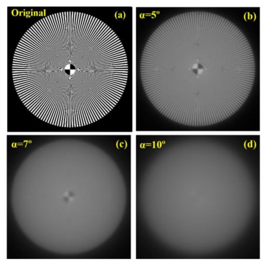 The modified eye model with a cataract straylight source was employed to generate retinal images of a Siemens star (Figure 7a) by employing the retinal surface as a detector. Figure 7b–d shows the retinal images of the visual test corresponding to different straylight angles (400 × 400 pixels size). The reduction in image contrast, relative illuminance, and sharpness is visually evident. The perceptual differences in the degraded images reveal drastic impoverishment of the image quality because of the veiling glare originated from the straylight cataract source.
