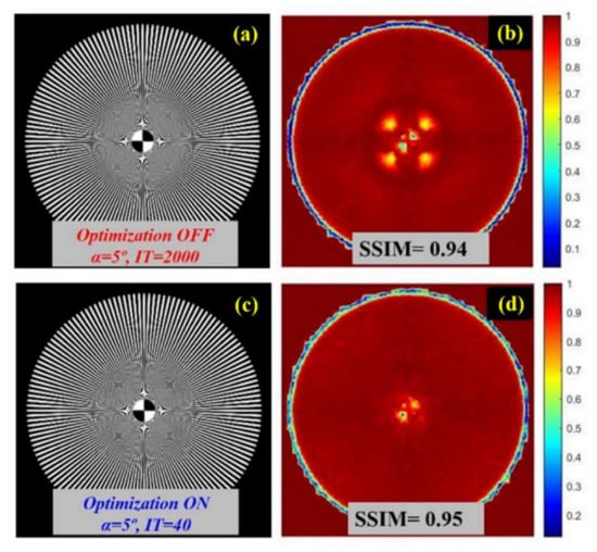 After applying Step #1, the algorithm was compared with and without applying the optimization process, as described in Step #2. For a direct comparison of our method with “regular” deconvolution processing, Figure 8a was carried out without iteration-optimization (Step #2 “OFF”) and Figure 8c shows the results after optimization activation (Step #2 “ON”). Notice that both non-optimized (Figure 8b) and iteration-optimized (Figure 8d) restored images show similar SSIM (0.94 and 0.94) and Sharpness (0.17 and 0.17) values, respectively, when compared to the original reference. However, without a stopping criterion, the iteration number must be set by the user and, in the case of IT = 2000, the computational cost exceeds the requirements for deconvolution by 21 times when using iteration optimization.