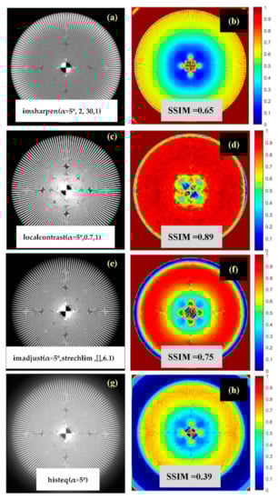 (a,c,e,g) Digitally enhanced images with popular MATLAB functions from a Siemens Star image degraded with stray-light (α = 5º, Figure 7b). (b,d,f,h) Corresponding SSIM (see Section 2.2.3) maps in relation with the original undegraded Siemens Star image shown in Figure 7a. (a) Image enhanced with function “imsharpen” with parameters: ‘amount’ = 2, ‘radius’ = 30, ‘threshold’ = 1. (c) Image enhanced with function “localcontrast” with parameters: ‘edgethreshold’ = 0.7, ‘amount’ = 1. (e) Image enhanced with function “imadjust” with parameters: [low_in high_in] = strechlim, ‘gamma’ = 6.1, (f) Image enhanced with histogram equalization function “histeq”. The function parameters for “imsharpen,” “localcontrast,” and “imadjust” were optimized to achieve a maximum SSIM.