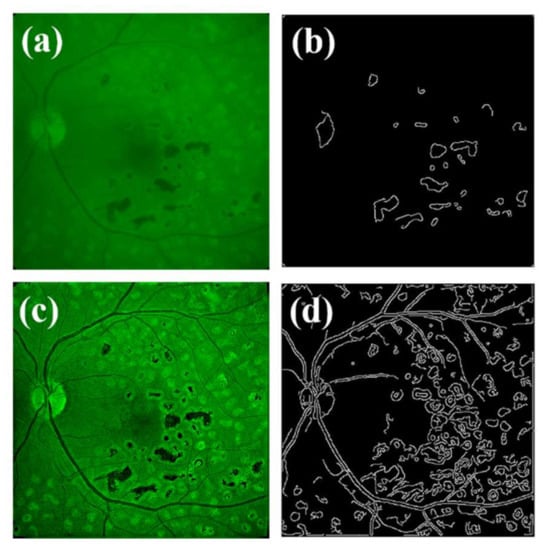 Original image from a diabetic retinopathy eye. (a) Edge segmentation of original image. (b) Restored image (c) and edge segmentation of restored image (d).