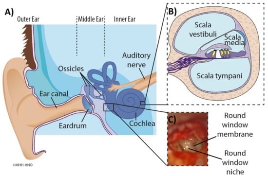 Over the last decades, there has been increasing interest in the possibility of treating inner ear disorders, such as idiopathic sudden sensorineural hearing loss (ISSHL) and Ménière’s disease (MD), by application of medication into the middle ear. Substances can pass from the middle to the inner ear via diffusion through the semipermeable round window membrane (RWM), which, in the human, is located deep in a recess, the round window niche (RWN), between the middle ear and inner ear (Figure 1) [,]. Various pharmacological treatments and drug delivery strategies have been proposed. Drugs can be administrated directly into the middle ear cavity, i.e., intratympanically (IT), by needle injection through the tympanic membrane, or injection through a ventilation tube placed into the tympanic membrane. Intratympanically applied drugs are absorbed into the inner ear perilymph through the RWM and, to a small amount, through the oval window. Comparing the drug concentrations in the perilymph after systemic administration and IT injection, the latter results in 425- to 1270-fold higher drug levels, corrected for dose [,] by bypassing the blood-labyrinthine barrier and first pass metabolism.