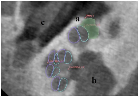 Using 3D Slicer and a custom made plug-in, points were placed manually at the midmodiolar apex (Cochlea_r-1), at midmodiolar basal turn (Cochlea_r-2), at the RWM (Cochlea_r-3) and on the tip of the bony overhang (RWN-1). These points allowed the determination of the midmodiolar axis by fitting a mean model of the ST (in turquoise) and the SV (in purple) in the CBCT data. The manually segmented RWN is shown in green. (a) bony overhang, (b) inner ear canal with N. vestibulocochlearis and N. facialis, (c) middle ear mucosa.