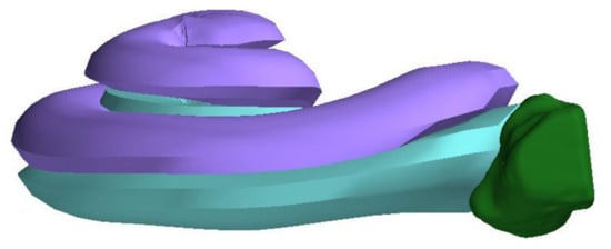 Three-dimensional reconstruction of the segmented cochlear with the ST (turquoise) and the SV (purple) and the RWN (green) in 3D Slicer.