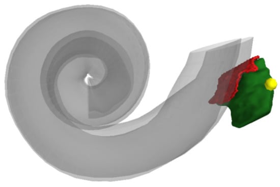 A threshold supported manual paint segmentation technique was chosen for segmentation of the datasets using 3D Slicer. A custom build plug-in for 3D Slicer was used to determine the midmodiolar axis by fitting a model of the scala tympani (ST) and the scala vestibuli (SV) (Figure 1B) in the DICOM data. This model includes the mean cross-sections of the scales based on n = 47 samples [] and additionally helped to determine the boundary of the RWN to the ST. For a determination of location, orientation and scalings, three points were placed at the cochlea: One was placed at the midmodiolar apex, the other one at the midmodiolar basal turn of the cochlea, and the third one at any point of the RWM (Figure 2). Moving these points leads to an update of the visualized model, thus allowing matching the ST/SV model to the bone cochlear interface. These three points define a common coordinate system relative to the cochlea so that magnitudes like the depth of the RWN and the length of the bony overhang could be determined in comparable directions []. The z-axis is defined parallel to the midmodiolar axis. The x-axis points from the midmodiolar axis to the round window, and a y-axis orthogonal to x-axis and z-axis. For defining the dimensions of the RWN, it was manually segmented in each slicing plane of the datasets. To get a comparable measurement of the RWN regarding its protrusion into the middle ear, an additional point (RWN_1) was set on the bony tip of the bony overhang (Figure 2). The distance from the point at the tip of the bony overhang to the midmodiolar axis is used to define the border of the RWN to the tympanic cavity: Using this distance to define a cylinder around the midmodiular axis, the manual segmentation is cut such that it does not extend beyond this cylinder. As a result of the described process, we were able to provide three-dimensionally reconstructed sets of the segmented cochleae and RWN of the human temporal bones, as exemplarily shown in Figure 3.
