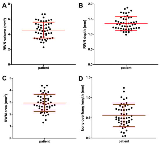 Graphical illustrations showing the wide range of the individual anatomical dimensions of the round window niche (RWN) volume (A) and depth (B), round window membrane (RWM) area (C) and bony overhang length (D) derived from segmentations of n = 50 clinical CBCT datasets. The individual data points, as well as the mean and standard deviation (red lines), are plotted.