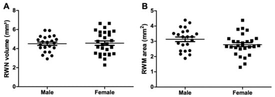 The RWN volume (A) and RWM area (B) did not differ between male and female patients.