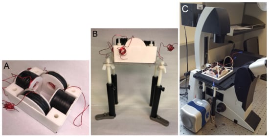 Figure 1. (A) Two pairs of wire spools in a perpendicular arrangement housed in a casing. The assembly is 13 cm long and 9.5 cm wide. (B) The platform that holds the wire coil assembly. (C) Entire coil insert with a sample holder inserted into a Leica DMI3000 microscope.