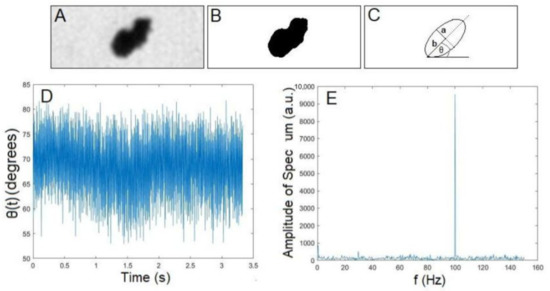 Figure 2. Sample image of an FeNP cluster, corresponding fitting of an ellipse in ImageJ, sample time series of an extracted particle cluster angle in ImageJ, and corresponding frequency spectrum obtained in MATLAB. (A) Filtered particle cluster image obtained from the camera. (B) Image in A after the thresholding used to estimate particle cluster size. (C) Ellipse fitted to the image in B after using the ImageJ “fit ellipse” function. (C) The angle θ between the major axis of the ellipse against the horizontal. The minor axis length a = 1.7 μ m and major axis length b = 2.5 μ m are also depicted. (D) θ ( t ) angle in time, θ ( t ) , for an FeNP oscillating in glycerol driven at 100 Hz. (E) Corresponding frequency spectrum and measured oscillation peak at 100 Hz, obtained via a Fourier transform method.