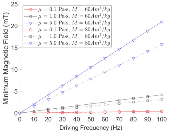 Figure 3. Calculated values using Equation (3) for the minimum magnetic field required to oscillate/rotate magnetic particles with ρ = 5.00 g/cm 3 and M = 60 Am 2 /kg (solid lines) or M = 80 Am 2 /kg (dotted lines) ranging from 10 Hz to 100 Hz, and fluid viscosities ranging from 0.1 Pa·s to 5.0 Pa·s.