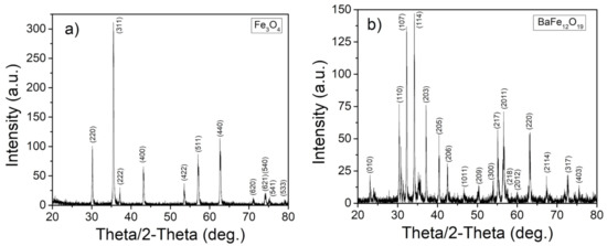 Figure 4. XRD patterns for (a) Fe 3 O 4 and (b) BaFe 12 O 19 .