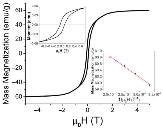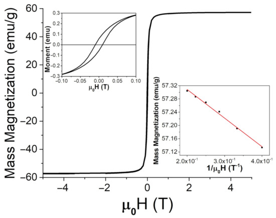 Figure 5. SQUID measurements for Fe 3 O 4 at room temperature (26 C or 298 K) up to 5 T, with an enlarged region for lower applied fields (upper insert) and a comparison between the magnetic moment and 1 / μ 0 H at high applied fields to determine the saturation magnetization from Equation (4), M S (lower insert).