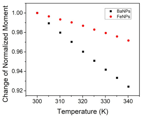 Measurements of the temperature dependence of magnetization were performed with a constant applied external field at 1 T; see Figure 7. The FeNPs exhibited a minimal reduction in the magnetic moment between room temperature (26 C or 298 K) and 57 C (or 330 K): approximately 2%. The BaPs experienced a reduction in the moment of about 6% over the same temperature range. Saturation magnetization is known to decrease with increasing temperature due to thermal disorder, which increases with temperature and hinders magnetic dipoles in aligning with the applied magnetic field [31,35,36].
