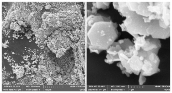 Figure 8. SEM images of BaFe 12 O 19 particles and the clusters that they form. On the left, magnification is 500×. On the right, magnification is 40,000×.