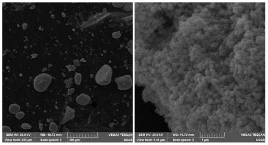Figure 9. SEM images of Fe 3 O 4 nanoparticles and the clusters that they form. On the left, magnification is 500×. On the right, magnification is 40,000×.