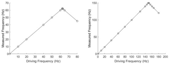 Figure 10. Driving frequencies compared to the experimentally measured frequencies for BaP clusters in water. These data were taken at frame rates of 125 Hz (left) and 300 Hz (right).