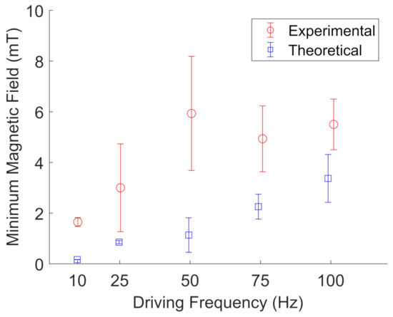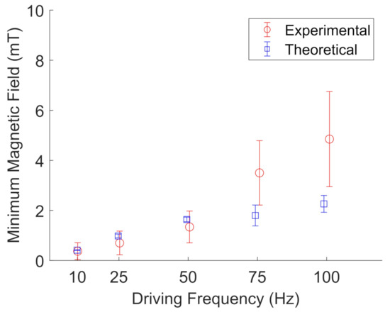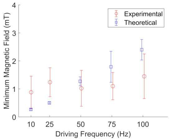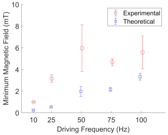 Figure 12. Experimental (red, open circles) measurements of the minimum magnetic field needed to oscillate FeNP clusters in glycerol compared to their theoretical values (blue, open squares) at a given driving frequency. The error bars represent the standard deviations of five different particle clusters. The data points are slightly offset along the x-axis to aid visualization.