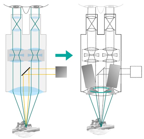 Since the late 1980s, visualization systems have received increasing attention in medicine [1]. Medical visualization systems are used to graphically display image data or three-dimensional (3D) volume data. These systems provide a broad spectrum of information to support the diagnostic process, therapy (e.g., surgical interventions) and post-treatment care. In recent years, the increasing availability of digital pre- and intra-operative medical data has made 3D visualization and information fusion more desirable. Previously, the sole focus lay on the visualization of the surgical site. However, now the interaction of observers with the data is gaining importance. If the information is available entirely in digital form, the user can view it on a monitor and manipulate it freely, e.g., in rotation, scale, brightness and contrast. This will aid in the understanding of complex anatomy, e.g., in the field of radiology [2]. Such visualization systems can even be extended into augmented or virtual reality (AR or VR). In many use cases, the acquisition and analysis of the data are decoupled. Since the pre-recorded 3D data is fused and then viewed offline, there is no limit to the number of observers. Observers in this context are to bee understood as, e.g., medical staff or staff in medical training who view the previously recorded 3D data. These observers’ views are flexible and independent of each other. The field of surgery is not afforded this luxury yet. The surgical site itself is viewed through a microscope, endoscope, or laparoscope, with no digital representation available. This precludes both the aforementioned information fusion and freedom of manipulation, leaving several aspects to be desired in contemporary surgical visualization systems. While endoscopy, laparoscopy, and microsurgery share similar limitations, we will take a closer look at the shortcomings of surgical microscopes here, since these devices are the focus of our work. In principle, however, the approach we will propose to mitigate said limitations is also applicable to endoscopy and laparoscopy. Ergonomics pose a problem in surgical microscopes since surgeons must remain in unfavorable positions for a long time during certain procedures, causing discomfort and muscle pain [3,4]. Furthermore, spatial and optical limitations allow only two simultaneous observers. Further observers require added opto-mechanical components, increasing cost, complexity, weight, and bulk of the microscope head. The added weight, in turn, complicates the construction of the balancing systems required for easy handling of the microscope by the surgeon [5]. In order to increase the overall number of observers and enhance the freedom of movement, some manufacturers employ a digital 3D streaming approach in their newest surgical microscopes. Examples for this can be found in the ZEISS KINEVO® [6] or Munich Surgical Imaging’s ARRISCOPE [7]. Here, users observe the microscope image on a monitor [8,9] or a head-mounted display [9,10,11], which alleviates the previously mentioned ergonomic problems. A further advantage of streaming systems is the inclusion of remote observers, e.g., for training purposes [12]. Especially with 3D streaming, the additional depth perception leads to a better understanding of the anatomical structures and the surgical area [13].
