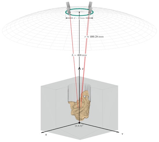 In a stereo camera setup, it is inherently better to use a large baseline, since an increased baseline leads to better accuracy of reconstruction via triangulation and, at the same time, generally allows the system to reconstruct more of the surface area. This is especially true for objects that extend perpendicularly to the cameras’ viewing directions. We, therefore, chose to arrange the cameras in our models on a ring with a diameter equivalent to the maximum usable baseline of real-world CMO surgical microscopes. This is limited by the CMO lens and typically ranges from 20 to 30 [25]. The arrangement on such a circle ensures that any two cameras, which lie exactly opposite each other, constitute a stereo pair with the greatest realistically feasible baseline. Figure 4 illustrates the aforementioned simplification steps and considerations.