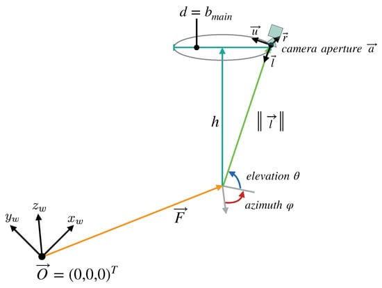 We modeled each individual camera as a pinhole camera according to Morvan [26]. The pinhole model consists of two components: An extrinsic matrix that contains the camera’s position and orientation, and an intrinsic matrix , which defines the projection onto its image plane. The calculation of the camera matrices is described in the following, beginning with the extrinsic matrix. The camera poses were specified using the Look-At parametrization known from the openGL rendering-API [27].