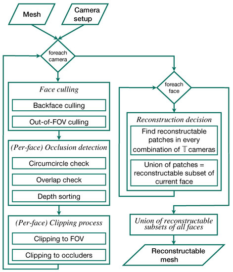 Our simulation framework finds the reconstructable subset of each face in the input mesh. To this end, the program must first find the parts of each face that are visible to the individual cameras in the simulated setup. This first step must be done once for each camera and consists of several operations on all faces, performed in the following order: Invisibility culling, occluder detection, clipping to the camera’s FOV, if applicable, and, finally, clipping to a set of known occluders. From the resulting subsets of each face which are visible to each of the cameras, the simulation can then derive the reconstructable subset of the face in question. The union of these reconstructable subsets of the individual faces comprises the reconstructable subset of the input mesh. The individual steps of the algorithm are described in more detail below. A schematic overview of the complete program is given in Figure 7. For explanations of the low level methods used throughout the algorithm, please refer to Section 2.3.5.