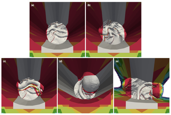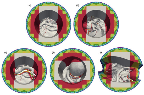 We created a total of ten different reference models with five different complex surgical site topologies, each embedded into two different corridors of the depths discussed above. The resulting models cover anatomic structures of varying complexity. The model “circ flat anatomy” in Figure 2a and Figure 3a contains a rather simple flat topology with only small blood vessels protruding close to the bottom. Adding a large diameter vessel spanning the channel, approximately 3 above the existing anatomy, yields the model “circ artery”, shown in Figure 2c and Figure 3c. Figure 2b and Figure 3b shows “circ angled anatomy”. This model contains a different topology consisting of a network of arteries, tissue furrows and undercuts, set at an angle in the operative corridor. A similar topology to this, albeit overshadowed by a large bulging structure protruding into the channel, is used in “circ overhang”, as shown in Figure 2d and Figure 3d. The final model, “elliptical channel”, in Figure 2e and Figure 3e, combines features from the aforementioned models (such as overhangs, tissue furrows, and undercuts) in the deformed elliptical channel.