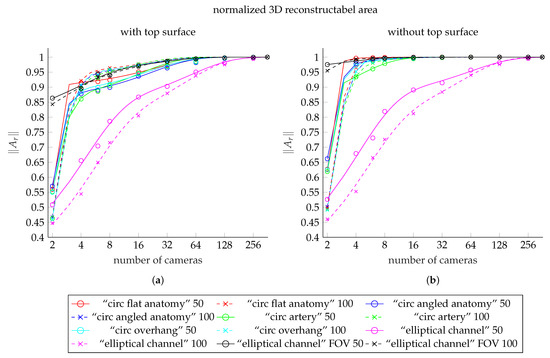 The use of 360 cameras in our setups is equivalent to distributing cameras in 1 steps along the ring, hence placing a camera every . This leads to the images of adjacent cameras overlapping almost completely, in turn meaning that any point that is visible to a camera on the ring is visible to at least one other camera. It is, therefore, safe to assume that 360 cameras provide the most complete possible reconstruction under the restrictions discussed in Section 2.2. Consequently, we use the surface that is reconstructable with 360 cameras as a benchmark. Since the meshes have different total areas, the results for each specific mesh were normalized to this maximum reconstructable area. This way, the results from different meshes can be directly compared to each other.