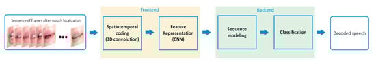 The workflow in the recent Lip Reading (LR) systems based on deep learning. Given an image sequence, the mouth regions are detected and cropped. Then, the frontend consists of a spatiotemporal convolution stage along with a CNN for capturing the short-term dynamics and finally extracting a feature vector for each frame. The features are the inputs of the backend that is composed of the sequence modeling and classification stages. Thus, the information is encoded by a sequence modeling stage, and the output of the sequence modeling is being fed to the classification module, which provides the class probabilities, i.e., the decoded speech.