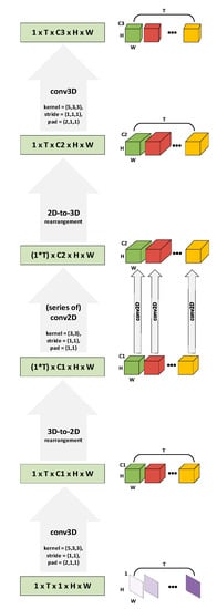 A 2D-to-3D rearrangement is implemented next, taking into account the length of the sequence. The 2D-to-3D conversion reconnect the produced feature maps based on the temporal order of the original sequence to provide a new sequence. Thus, the output of this 2D-to-3D step is a new sequence , where , and are the depth of each element of the sequence that is determined by the previous step of 2D convolutions.