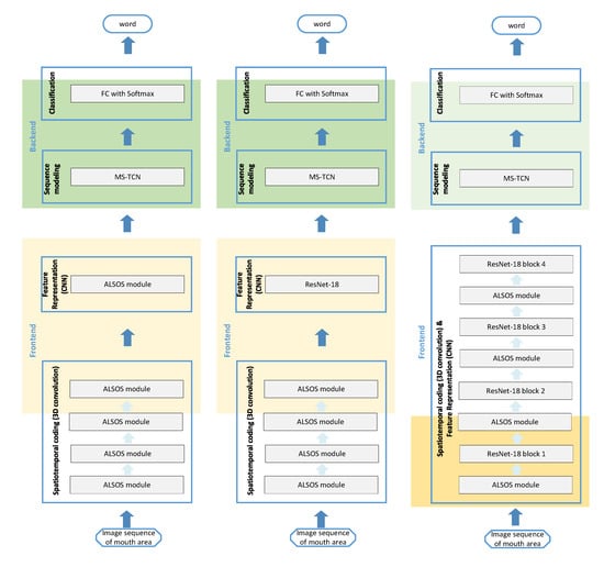 These three ALSOS based LR systems are presented in the Figure 3, and they constitute the three core directions to incorporate a spatiotemporal module in the frontend of the framework. The first described combination is illustrated in the middle of Figure 3 (typical case where ALSOS works as the spatiotemporal coding stage) while to the left is the second referred combination (where the frontend is utilized just with ALSOS modules) and the third proposed architecture is presented to the right (where ALSOS is included between ResNet blocks). It is good to mention here that the number of stacked ALSOS modules in each system is defined after due diligence in order to provide the best performance. The backend of the three designed LR systems is fed with the vectorial representations of input sequence and provides the sequence modeling process. In this manner, the vectors produced for each frame need to be mapped to a final feature vector representing the sequence and next, this final feature vector needs to provide a mapping to one word. To achieve this, a non-causal TCN is used for learning the sequence modeling from sequence-to-sequence [21,23]. The TCN’s outputs are handled with an attention mechanism through averaging in order to extract the final feature vector. This final vector is mapped to one of the words via fully connected layer with Softmax activation that acts as a classifier. All the different LR systems based on the ALSOS and CNNs variants are utilized with the cross-entropy loss that is applied to the output of the fully connected layer in the backend, and thus, the whole system can be trained using an end-to-end learning scheme.