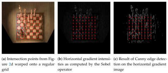 If , we detected all lines of the chessboard and no further processing is needed. When , as is the case in Figure 4a, we compute the horizontal gradient intensities for each pixel in the warped image in order to determine whether an additional vertical line is more likely to occur one unit to the left or one unit to the right of the currently identified grid of points. To do so, we first convolve the greyscale input image with the horizontal Sobel filter in order to obtain an approximation for the gradient intensity in the horizontal direction (Figure 4b). Then, we apply Canny edge detection in order to eliminate noise and obtain clear edges (Figure 4c). Large horizontal gradient intensities give rise to vertical lines in the warped image, so we sum the pixel intensities in Figure 4c along the vertical lines at and (with a small tolerance to the left and to the right). Then, if the sum of pixel intensities was greater at than at , we update , or otherwise . We repeat this processs until . An analogous procedure is carried out for the horizontal lines with and . Finally, these four values describe the two outer horizontal and vertical lines of the chessboard in the warped image. The optimal parameters for the Hough transform and Canny edge detectors described in this section are found using a grid search over sensible parameters on a small subset of the training set.