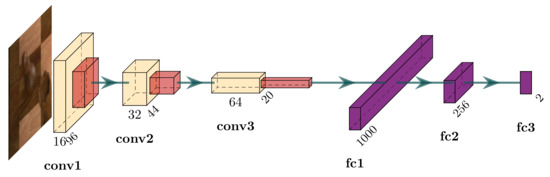 We devise six vanilla CNN architectures for the occupancy classification task, of which two accept pixel input images and the remaining four require the images to be of size pixels. They differ in the number of convolutional layers, pooling layers, and fully connected layers. When referring to these models, we use a 4-tuple consisting of the input side length and the three aforementioned criteria. The final fully connected layer in each model contains two output units that represent the two classes (occupied and empty). Figure 7 depicts the architecture of cnn which achieves the greatest validation accuracy of these six models. Training proceeds using the Adam optimiser [28] with a learning rate of for three whole passes over the training set using a batch size of 128 and cross-entropy loss.