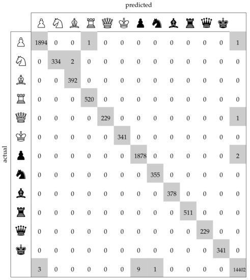The average number of misclassified squares per board lay at 0.15 on the test set as compared to 0.27 on the training set. The confusion matrix in Figure 11 facilitates a more detailed analysis of the mistakes. The last row and column, representing the class ‘empty square’, contain the greatest number of incorrect samples which is a result of the worse performance of the occupancy classifier compared to the piece classifier. However, one must also take into account that the occupancy classifier had a more difficult task in this regard, since it had to determine whether a square was empty even when it was occluded by a piece in front of it. The piece classifier (which had an accuracy of 99.99%) yielded only three errors: in two cases it confused a knight with a bishop, and in one case a pawn with a rook. These results on the test set clearly demonstrate that the chess recognition system was highly accurate.