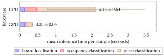 For a chess recognition system to be practically effective, it must also be able to perform an inference in a reasonable amount of time. To test this, we recorded the execution time for each of the test set samples on a Linux machine with a quad-core 3.20 GHz Intel Core i5-6500 central processing unit (CPU) and a 6 GB NVIDIA GeForce GTX 1060 graphics processing unit (GPU). We conducted this experiment twice: once with GPU acceleration and once without. Figure 12 shows that the pipeline was around six times faster when utilising the GPU. This is to be expected because the forward pass through the neural network was optimised for parallel computation on a GPU. Therefore, execution time of the occupancy and piece classifiers was significantly lower on the GPU, whereas the board localisation (which ran on the CPU regardless) took a similar amount of time across both trials. Overall, the mean inference time was less than half a second on the GPU and just over 2 seconds on the CPU, although the latter measurement exhibited a significantly greater variance. The speed was sufficient for most practical purposes, and the GPU-accelerated pipeline may even be suited for real-time inference at two frames per second on just one GPU. Lastly, it should be noted that the occupancy classifier needed just a fraction of the time required by the piece classifier. This can be explained by the more complex architecture of the InceptionV3 [32] network as opposed to the ResNet [30] model and the greater input size which resulted in the number of parameters being twice as high in the piece classifier.