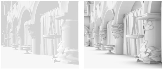 Ambient occlusion is a rendering technique used to improve the realism of a scene. It is an empirical technique introduced for the first time by Zhukov et al. to approximate the effects produced by global illumination systems [20]. The ambient occlusion models how a certain surface is illuminated by indirect light caused by the reflections of direct light over the various surfaces of the scene. Figure 3 shows the improvements that such technique brings to a rendered image.