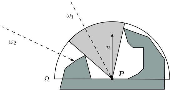 We describe the strategy used to determine if a point P of a triangle of the mesh is visible or not. Suppose K rays, say , starting from point P have been generated. Notice that each ray is well identified by its direction . Then, based on the notion of ambient occlusion and, in particular, on its Monte Carlo estimate in Equation (2), the visibility score of a point P can be expressed as