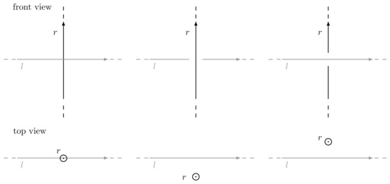 Possible line configurations in space: on the left l and r intersect, in the middle l goes clockwise around r while on the right l goes counter-clockwise around r.