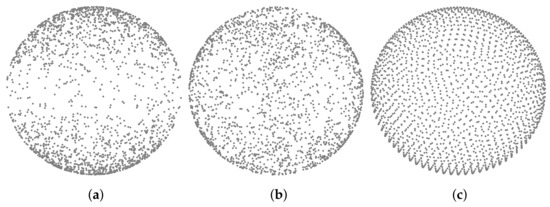 Comparison of three different points distributions on the surface of a sphere: (a) Cosine-weighted, (b) Uniform, (c) Fibonacci.