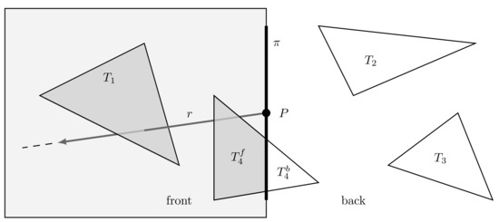 - Jones, R. Intersecting a Ray and a Triangle with Plücker Coordinates. RTNews 2000, 13, 67. [Google Scholar]